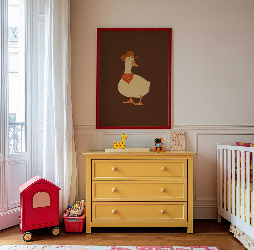 Gi hjemmet ditt et sjarmerende og lekent preg med denne herlige veggkunsten som viser Bo the Cowboy Duck kledd i varme jordtoner, med sin karakteristiske hatt og bandana mot en rik brun bakgrunn. Det minimalistiske uttrykket og den balanserte fargepaletten skaper en rolig atmosfære uten å ta for mye plass. Designet for å føles både tidløst og lekent, passer det perfekt over sprinkelsengen, i lesekroken eller ved skrivebordet. Et nydelig valg til barnerommet, lekerommet eller moderne familierom – og passer naturlig inn i skandinavisk interiør og gallerivegger. Trykket på matt kunstpapir i museumskvalitet som bevarer farger og detaljer i mange år.