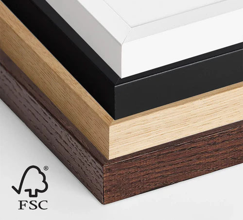 Våre høykvalitetsrammer er tilgjengelige i svart, hvit, eik, mørk eik og gullaluminium. Glassene er laget av akryl, som både er lett og slitesterkt. Alle rammer kan henges både vertikalt og horisontalt.