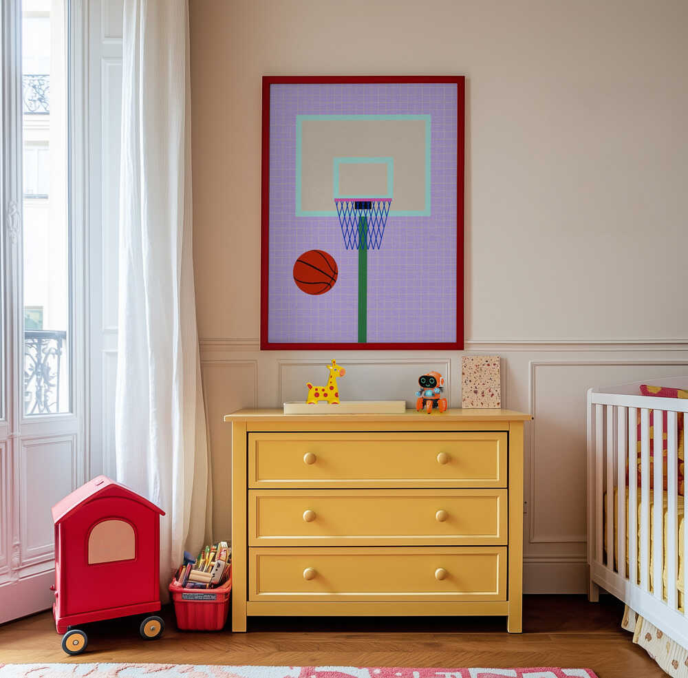 Gi hjemmet ditt et sporty og fargerikt preg med denne lekne veggkunsten som viser en basketball i luften mot et lavendelfarget rutemønster og en enkel kurv. Det minimalistiske uttrykket og den balanserte fargepaletten skaper en rolig atmosfære uten å ta for mye plass. Designet for å føles både tidløst og lekent, passer det perfekt over sprinkelsengen, i lesekroken eller ved skrivebordet. Et moderne og energisk valg til barnerommet, lekerommet eller moderne familierom – og passer naturlig inn i skandinavisk interiør og gallerivegger. Trykket på matt kunstpapir i museumskvalitet som bevarer farger og detaljer i mange år.