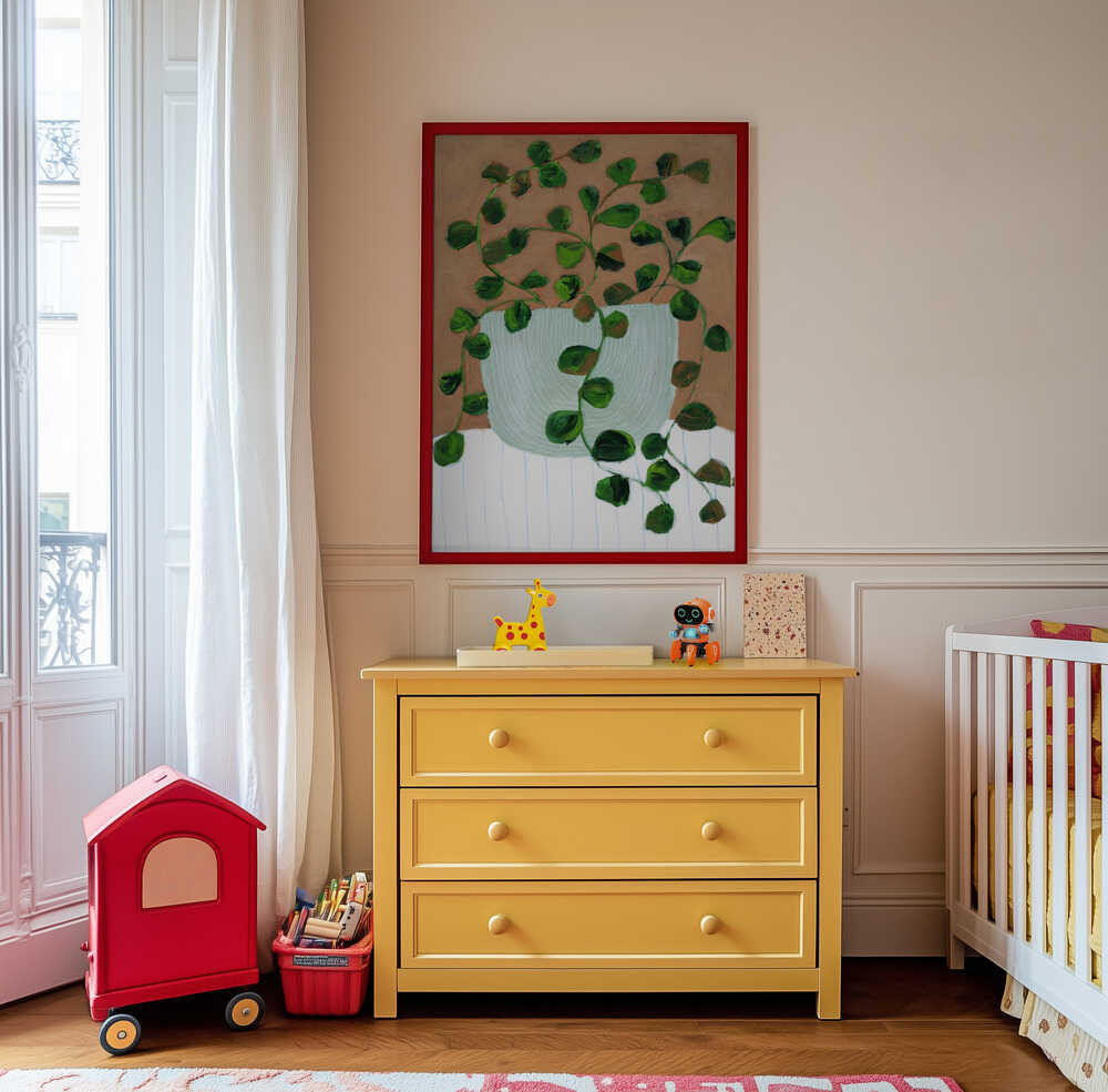 Gi hjemmet ditt et naturlig og beroligende preg med denne veggkunsten som viser grønne, hengende planter i en myk, teksturert potte mot varme jordfarger. Det minimalistiske uttrykket og den balanserte fargepaletten skaper en fredelig atmosfære uten å ta for mye plass. Designet for å føles både tidløst og lekent, passer det perfekt over sprinkelsengen, i lesekroken eller ved skrivebordet. Et vakkert og moderne valg til barnerommet, lekerommet eller moderne familierom – og passer naturlig inn i skandinavisk interiør og gallerivegger. Trykket på matt kunstpapir i museumskvalitet som bevarer farger og detaljer i mange år.