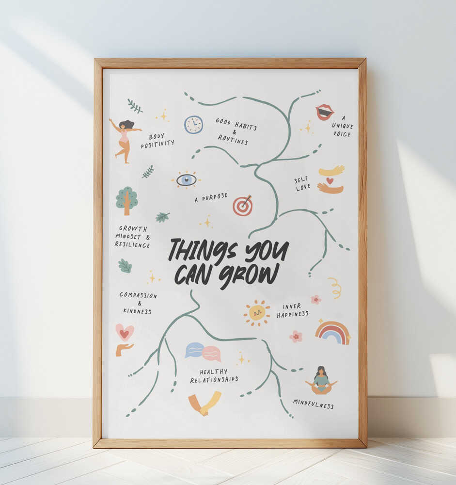 Lys opp dagen din og finn inspirasjon til personlig vekst med denne lekne og tankefulle plakaten som minner deg på alle de vakre tingene du kan dyrke i deg selv. Fra selvtillit og tålmodighet til kjærlighet, glede og egenomsorg – hvert illustrerte element tilfører varme og positivitet til rommet. De myke pastellfargene og håndtegnede ikonene skaper en rolig, men oppløftende stemning, perfekt for soverom, hjemmekontor eller kreative hjørner. En nydelig daglig påminnelse om at vekst kommer i mange former. Trykket på matt papir i museumskvalitet, bevarer det sin sjarm og sitt budskap i mange år.